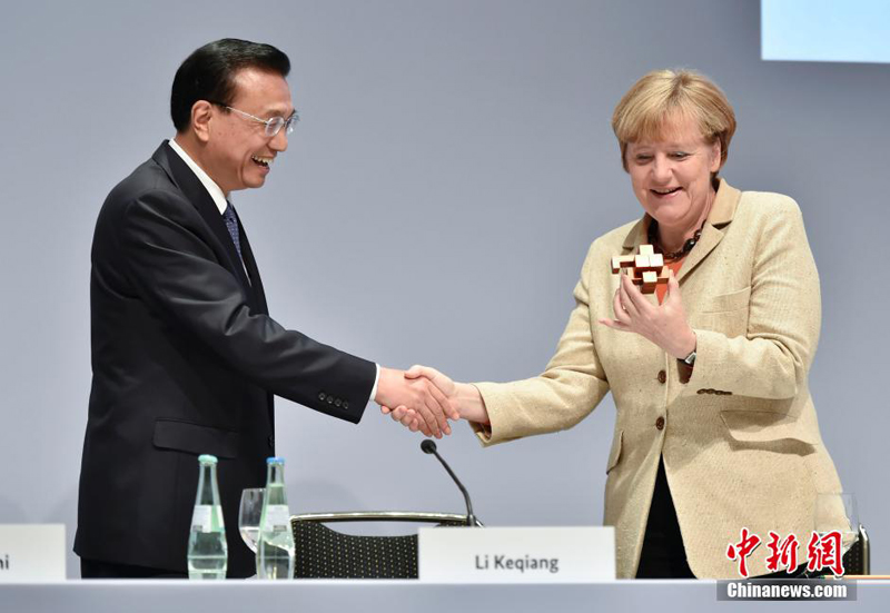 2014年10月10日,中德经济技术论坛上,李克强总理将一只精巧的鲁班锁送给德国总理默克尔。他说,这是中国天津中德职业技术学院学生的作品,寓意中德制造业深度融合。摄影 中新社记者 刘震