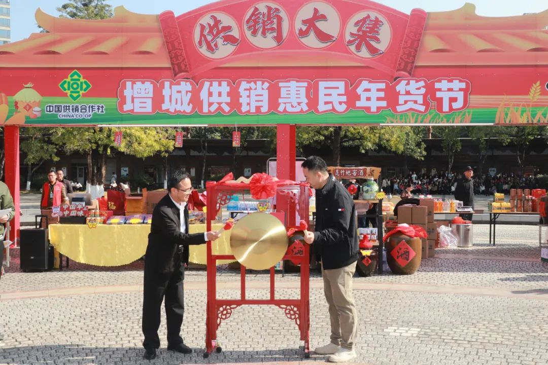 1月19日上午,随着清脆的锣声响起,由增城区供销合作总社指导,广州增供农产品有限公司承办的2025年增城供销惠民年货节暨供销大集开“吉”仪式在增城广场北广场正式开启。活动以“展现供销文化、助力乡村振兴”为主题,通过联农带农、集采集配、统购统销、年货展销等线上线下多种模式,搭建起城乡互利共赢的销售平台,宣传展示增城以及对口帮扶地区特色优质农副产品,丰富市民年货消费选择,吸引广大市民前来采购年货、赶供销大集,助力增城特色农产品产业化发展。广州市供销合作总社流通处、增城区发展改革局、增城区总工会相关负责同志,增城区供销合作社系统干部职工,“社村”合作负责人、参展企业等合作伙伴共约50人参加活动。