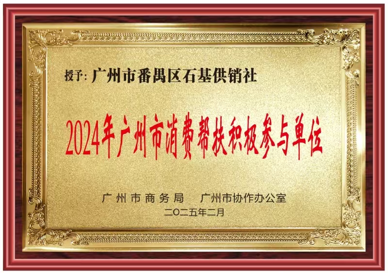 近日,由广州市商务局、广州市总工会、广州市协作办主办的2024年度广州消费帮扶工作总结大会在广州国际医药港召开。会议上,石基供销社消费帮扶工作获得肯定和表彰,被授予“2024年广州市消费帮扶积极参与单位”荣誉称号。目前,石基供销社已连续4年被广州市商务局、广州市协作办评选为“广州市消费帮扶积极参与单位”。