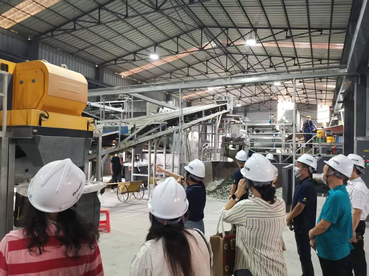 调研组首站抵达白云区玻璃回收处理中心,深入了解其生产运营情况,考察其“回收—分拣—处理—再利用”全流程标准化作业模式。该中心通过机械化设备提升玻璃破碎、分选效率,配套分类存储区域实现资源高效流转,其“企业化运营+专业化管理”的机制为再生资源处理提供了可复制的操作范式。随后前往嘉禾街杨村园“两网融合”示范点,重点学习如何通过再生资源回收网络与环卫清运系统的衔接,实现“前端源头投放、中端收运、末端处置利用”三个环节深度融合,提高再生资源精细化利用运营成效。同时,调研组与白云区供销联社相关部门负责同志在现场对各自开展安全生产管理的经验进行了充分交流。