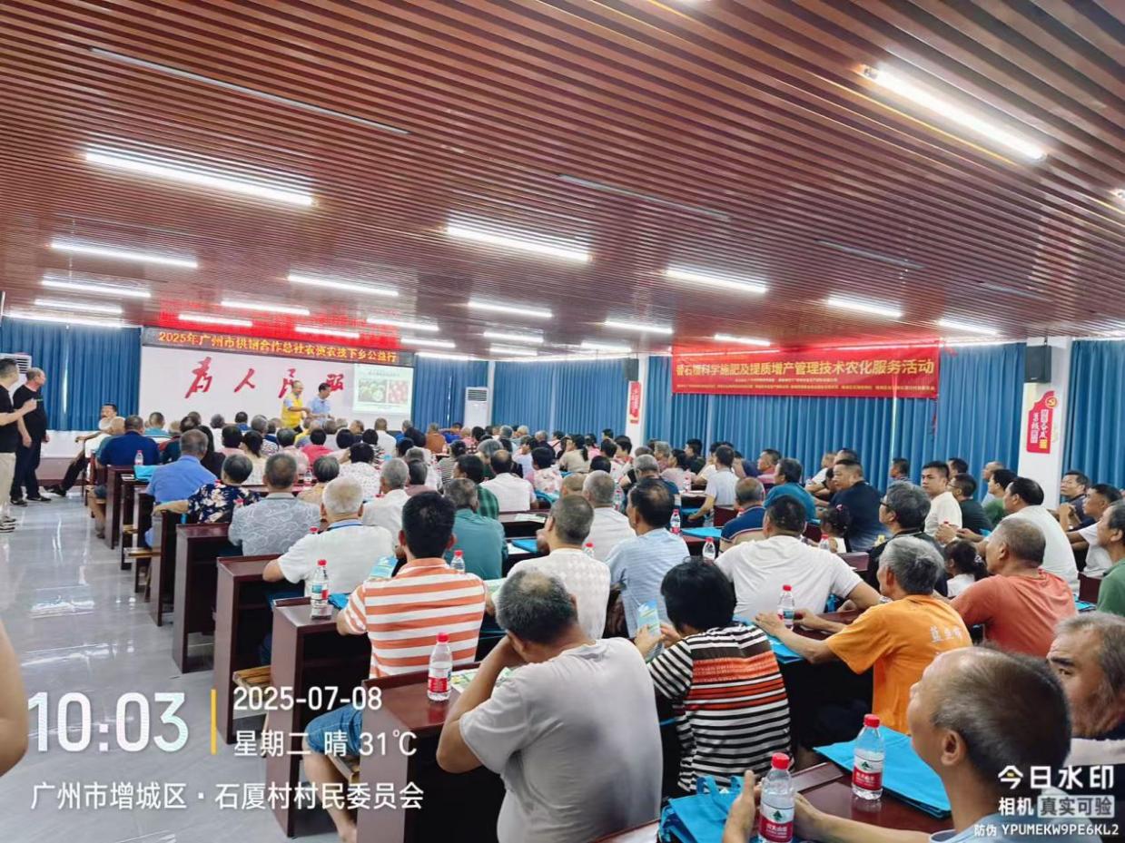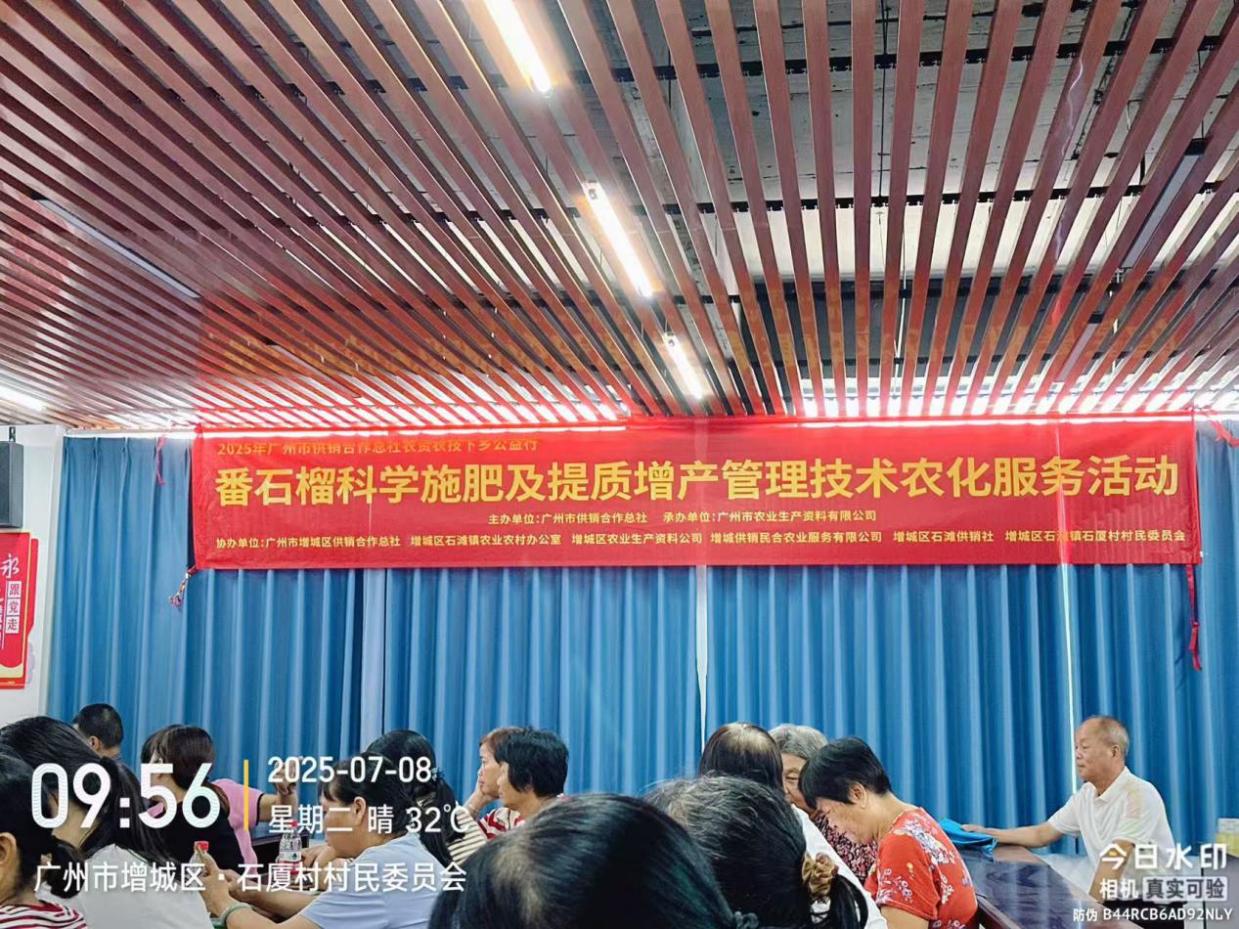 为全面深入推进供销社农业社会化服务,助力番石榴产业高质量发展,7月8日上午,广州市供销合作总社联合增城区供销合作总社、石滩镇农业农村办公室等部门,在增城区石滩镇石厦村村委会共同举办2025年广州供销合作总社农资农技下乡公益行活动。