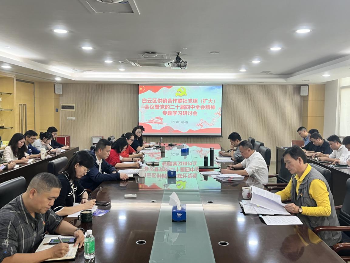 近日,白云区供销联社召开党的二十届四中全会精神专题学习研讨会,深入学习贯彻党的二十届四中全会精神及省委、市委、区委相关会议精神,围绕“十五五”规划谋划和年度重点工作开展交流研讨。白云区供销联社党组成员、机关干部、社属企业负责人及党员代表参加学习。
