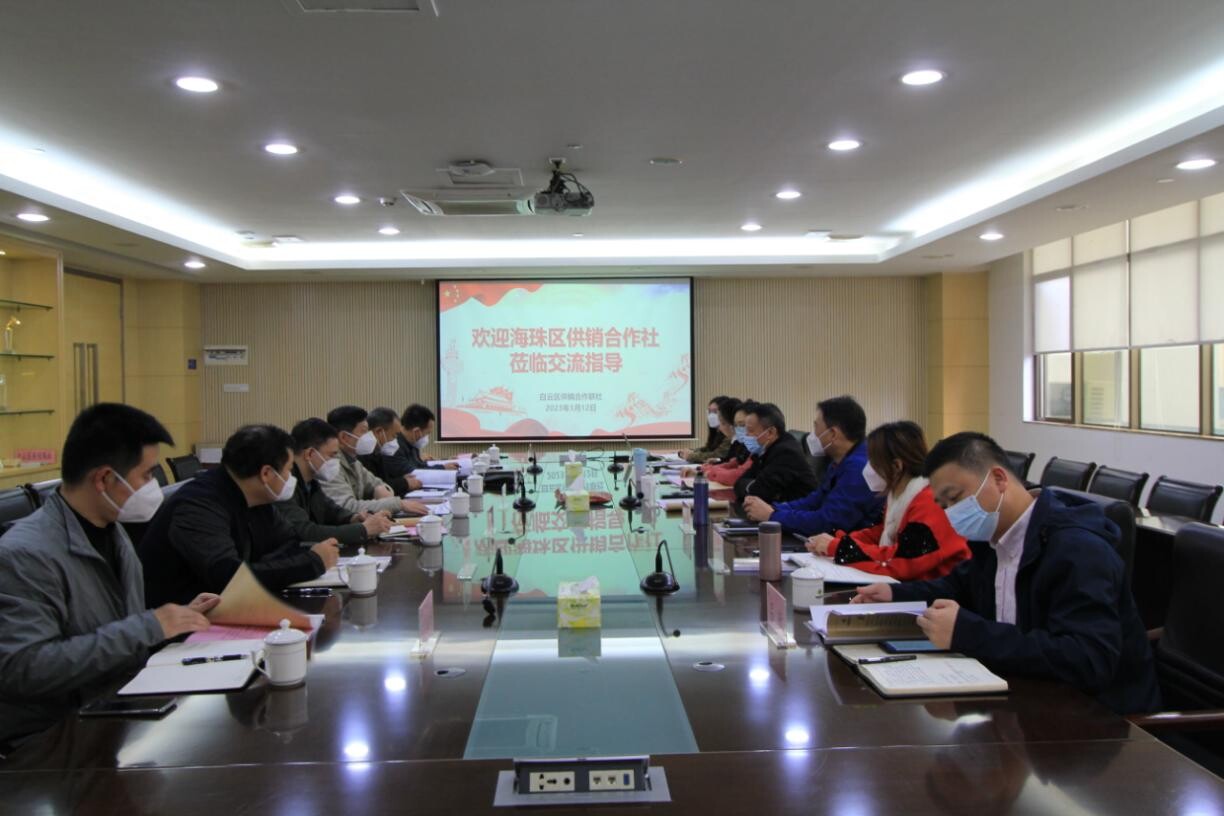为推进党的二十大决策部署在供销社落地生根,实现高质量发展,1月12日下午,海珠区供销社党组书记黄泽亮带领班子成员及科室、社属企业负责人一行8人,到白云区供销联社调研学习。白云区供销联社党组书记、理事会主任蔡文炎亲自主持座谈会议。