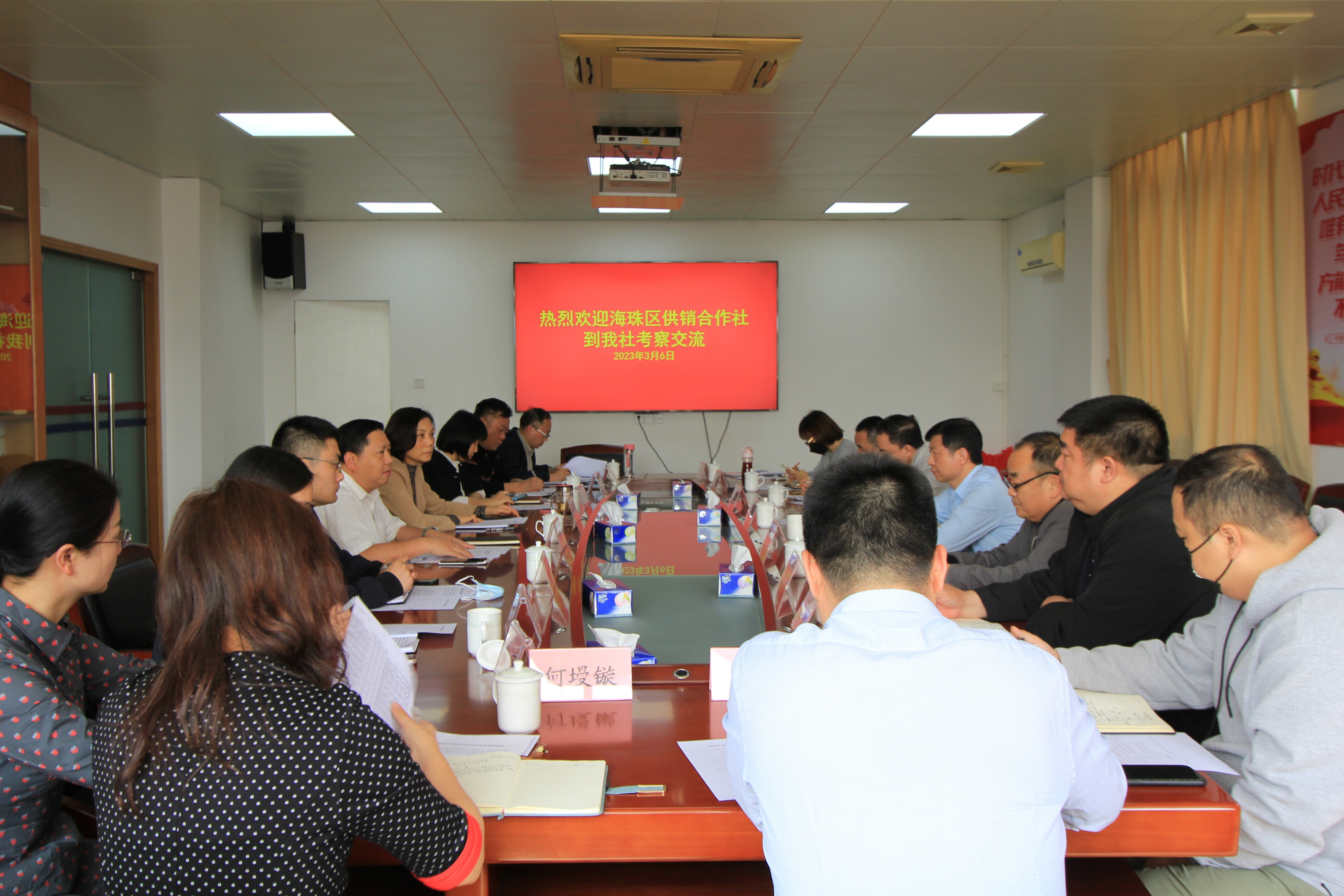 为在全面贯彻落实党的二十大精神的开局之年筑好基、起好步,推动供销社事业高质量发展向前向好,3月6日下午,海珠区供销合作社(以下简称“海珠区社”)党组书记、理事会主任黄泽亮带领班子成员及科室、社属企业负责人一行9人,到番禺区供销合作社联合社(以下简称“番禺区社”)调研学习。番禺区社党组书记、理事会主任杨绍茂亲自主持座谈会议,其他领导班子成员及各科室负责人一同座谈交流。
