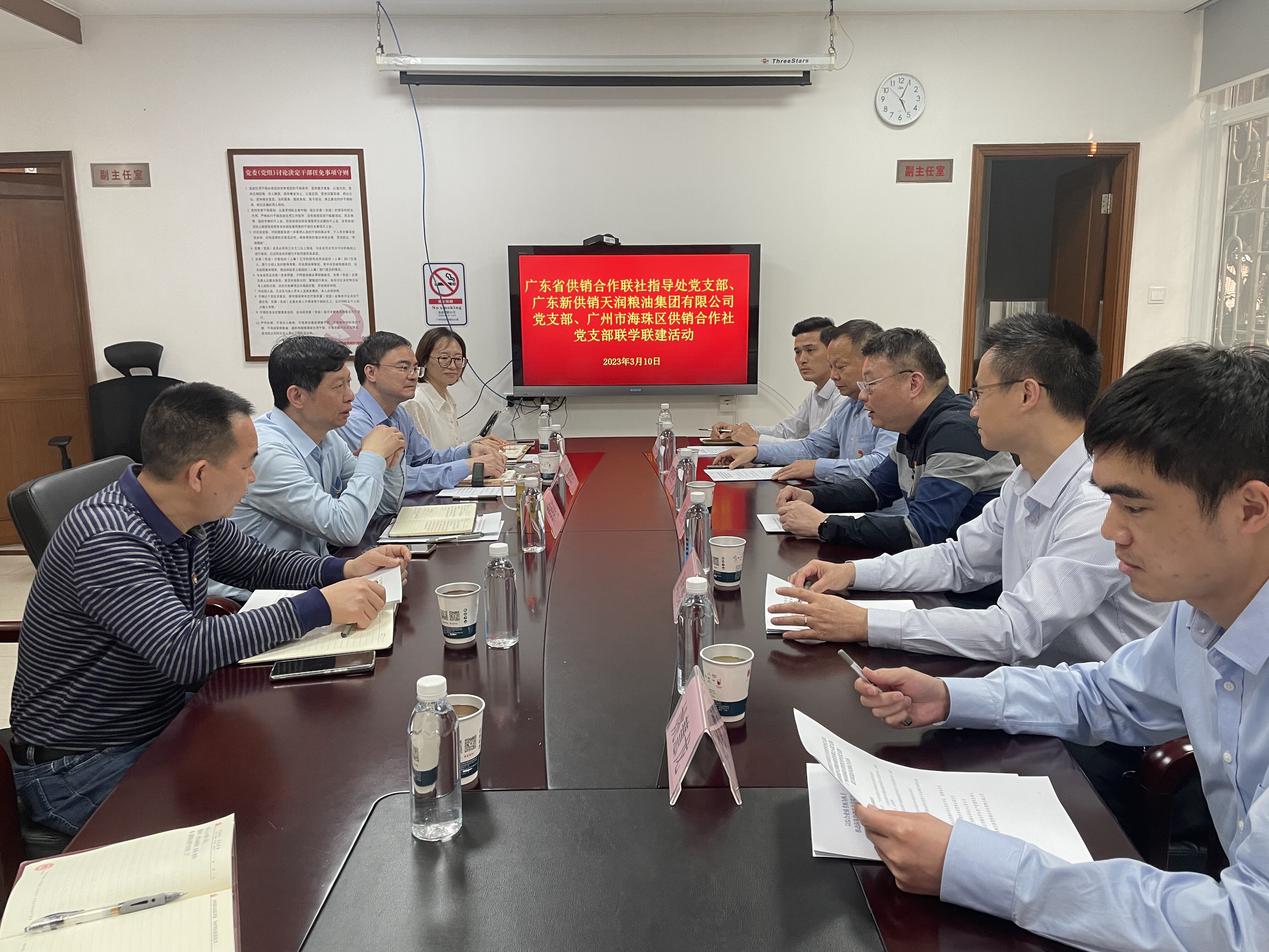3月10日下午,广东省供销合作联社合作指导处党支部、广东新供销天润粮油集团有限公司第一党支部和广州市海珠区供销合作社党支部联合开展联学联建活动。省供销联社合作指导处处长黄红涛,天润集团党委书记、董事长、总经理周灼维,天润集团党委副书记、纪委书记唐晓明和海珠区供销社党组书记、理事会主任黄泽亮共同参与活动。