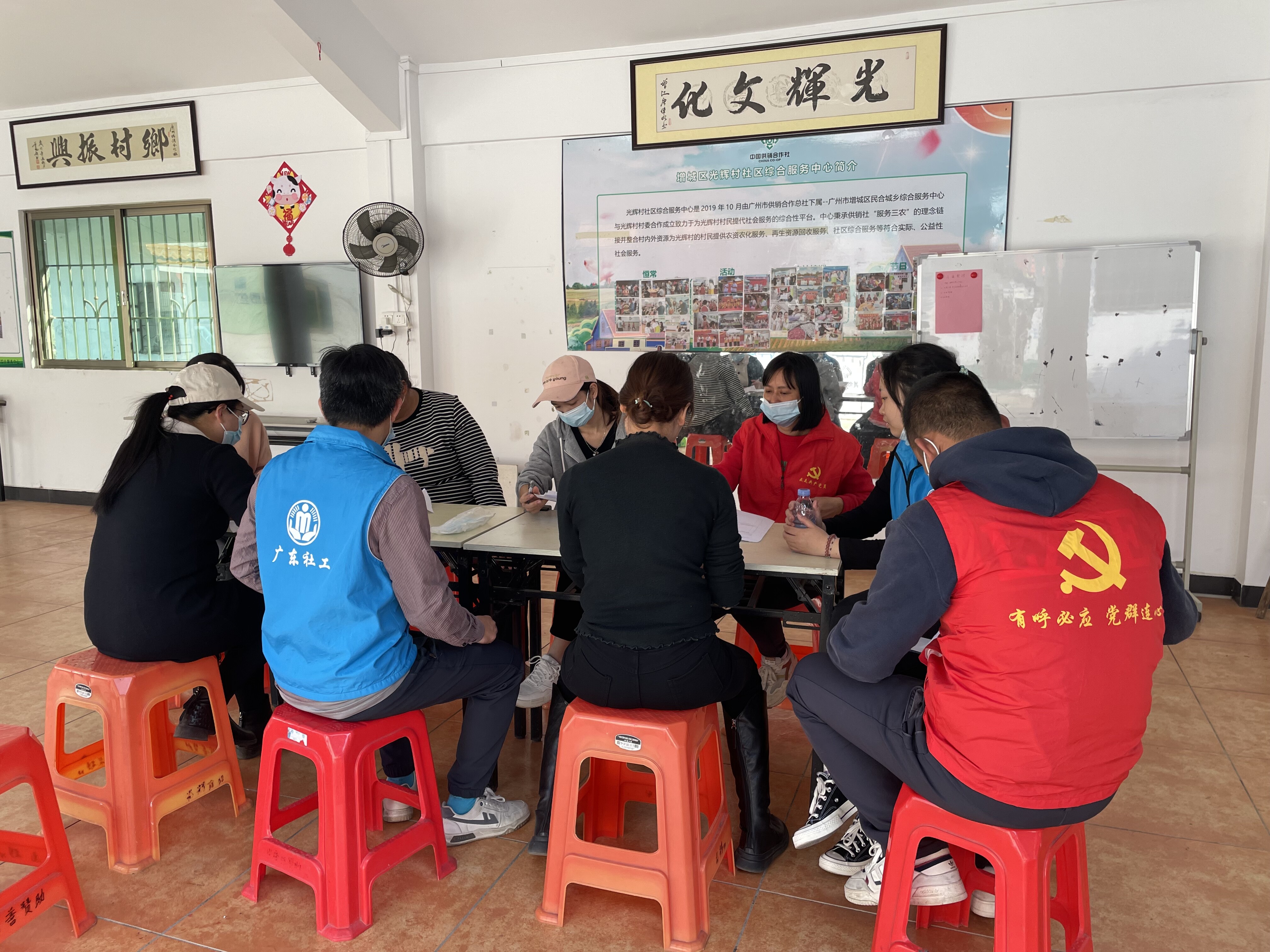 根据当日流程安排,首先由社工对党员志愿者介绍光辉村的基本情况与当地的特色文化实践队对光辉村有了更深入的了解,接着社工告知活动主要目的是绘画光辉村具有标志性的红色景点、祠堂、公园、鱼塘、超市等类似可用资源;由党员志愿者、社工、村民分两组分别负责光辉村以元芳路和胜利路为路线的资源绘图。