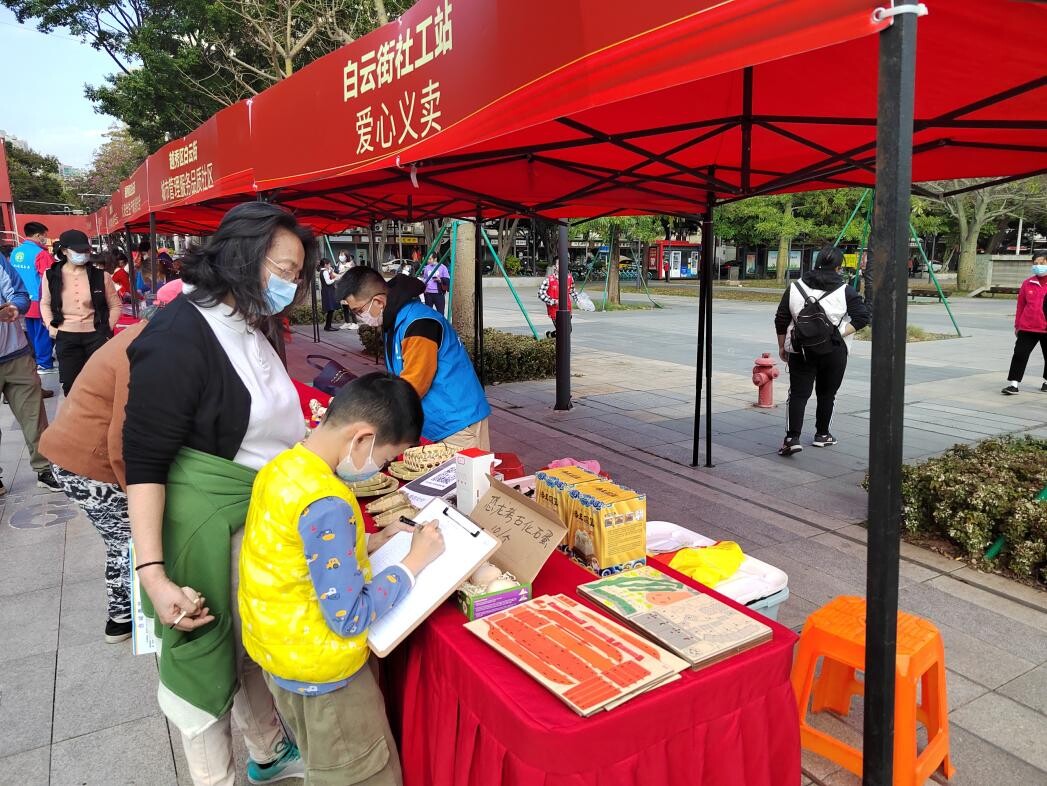 活动现场,白云街社工服务站也开展了爱心义卖活动,展示社区青少年参与红色文化学习的成果,现场招募志愿者参与社会实践,吸引了不少青少年及家长的关注。