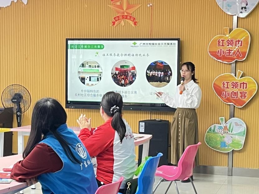 紧接着,副总干事赵楠回顾了自己作为新围村社区综合服务中心第一个驻村社工的心路历程,就驻村开展社会服务、链接公益资源等分享了个人经验。