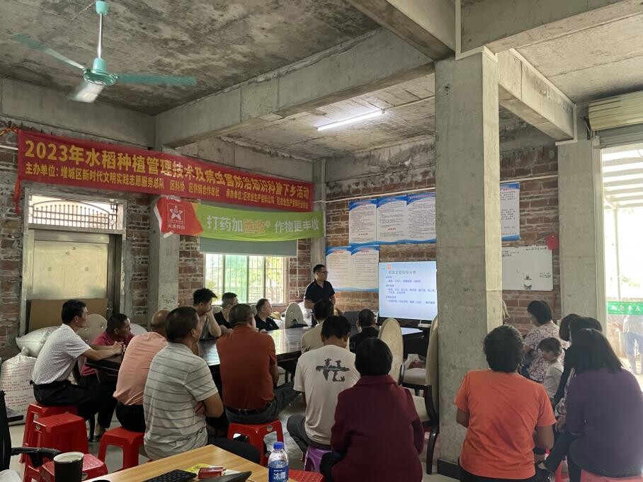 4月28日,增城区农业生产资料公司、增城区农业生产资料行业协会和增城区五丰专业合作社联合在增江街五星村举办水稻种植管理技术及病虫害防治知识培训活动,依托农民专业合作社和农资行业协会,围绕春耕生产需求导向,采取“龙头企业+专业合作社+农户”或“企业+行业协会+专业合作社”等多种方式,集聚农业技术优势资源,不断拓宽“联农带农”路径,组织广东天禾农艺师等技术人员下乡进村,面对面解答群众疑惑,点对点传授农业知识,解决水稻种植户面临的农业技术难题,助力春耕粮食生产。来自增江街五星村水稻种植户共40余人参加培训。