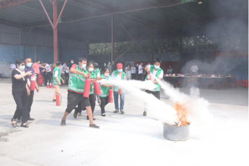理论培训结束后,教官带领全员进行消防设施实操演练,现场示范灭火过程,教授灭火器灭火原理、扑救方法和防毒面具的正确佩戴方式,参与培训人员跃跃欲试,轮流进行灭火实操练习,切实提高实操技能。