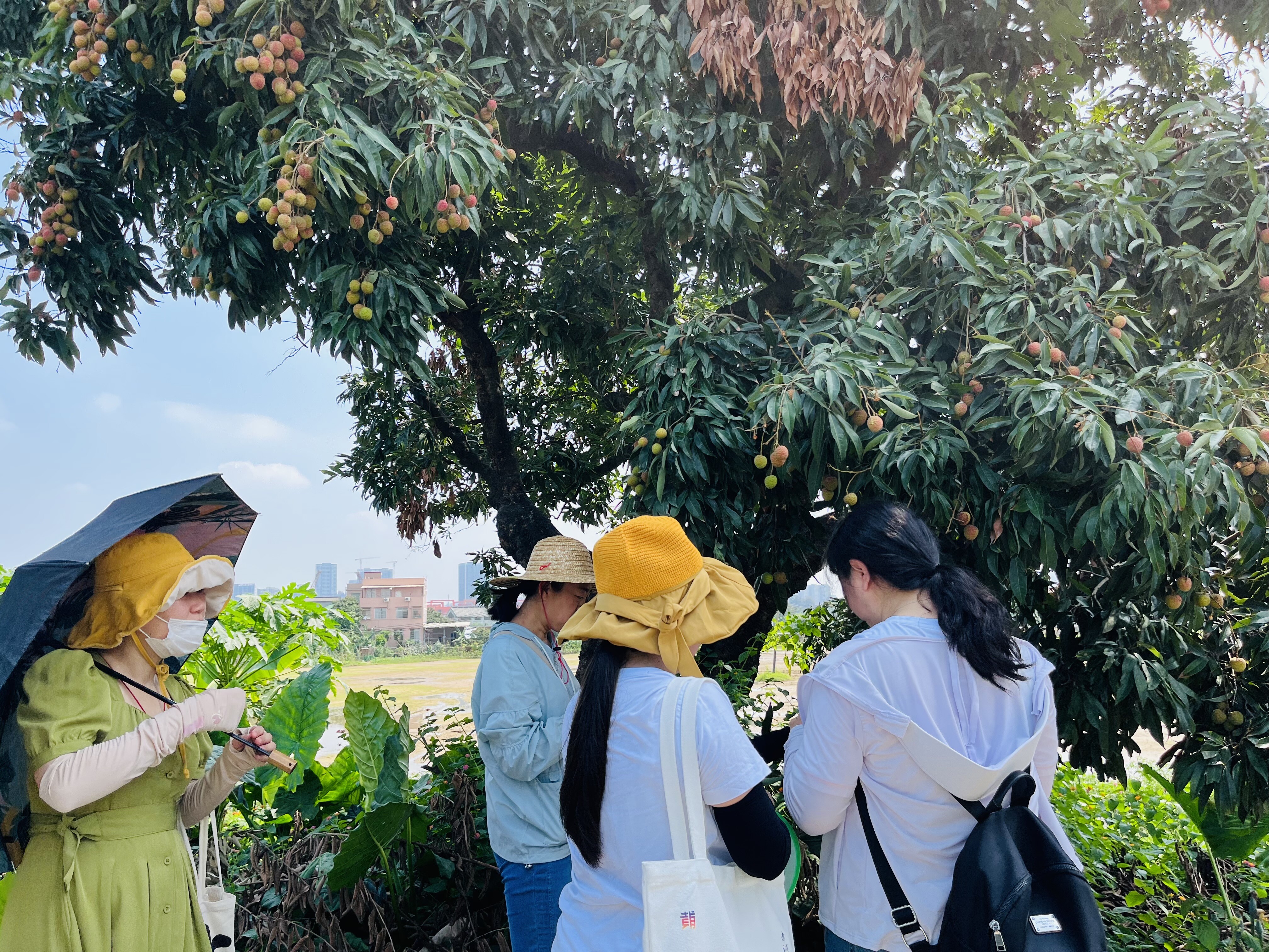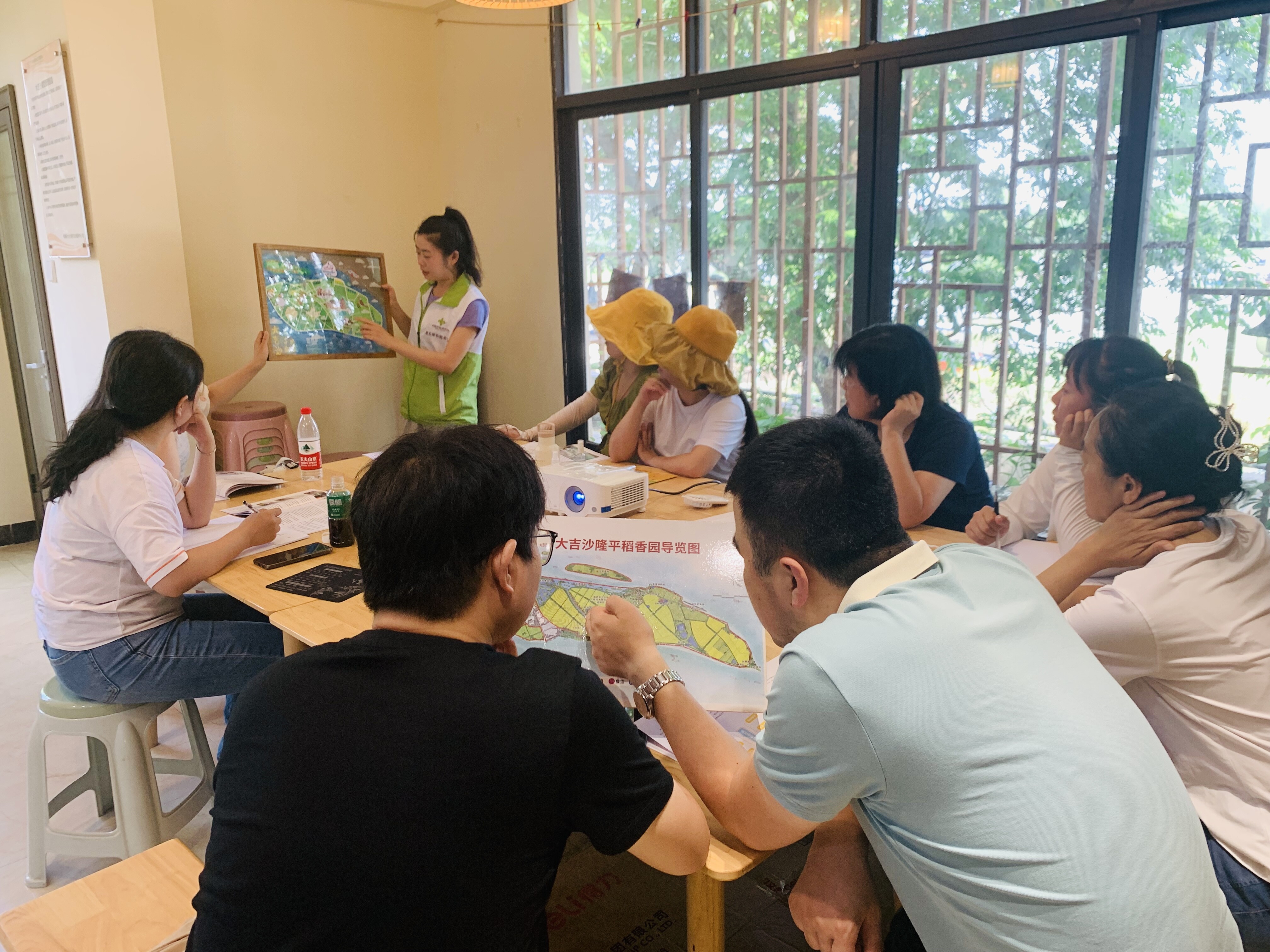 接下来助农社工带领参访团沉浸式体验大吉沙岛的农旅服务,参观了隆平稻香公园、大吉粮仓及帐篷营地,并沿途认识许多岭南的水果种类,对比粤、新两地的农业种植差异及乡村社工服务特点,通过农旅服务交流迸发在乡村服务过程中新的服务思路。
