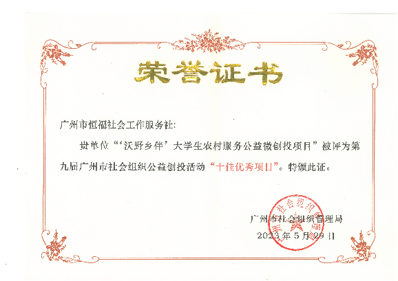 2023年6月15日下午,第九届广州市社会组织公益创投活动总结大会暨第十届项目签约大会在广州(国际)科技成果转化天河基地国际会议中心举行。由广州市恒福社会工作服务社实施的“‘沃野乡伴’大学生农村服务公益微创投”项目荣获广州市社会组织第九届公益创投活动“十佳优秀项目”。