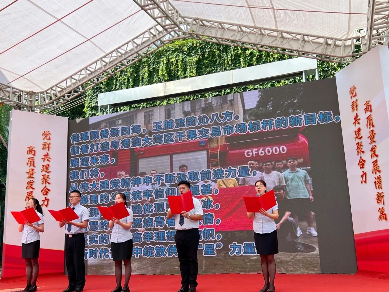 公司党员、团员青年李嘉明、卢冠衡、王映梅、黄荆、吕锦珠五名同志朗诵表演原创作品《“初心如磐 勇毅前行”——在新时代奋进中绽放供销“星”力量》,作品展示了供销社和星洲源在践行初心使命、坚持党建引领、推动高质量发展中的经历和取得的成果和经验。朗诵过程中,他们把对党的热爱、对服务“三农”的追求,融入到青春的舞台中,赢得了昌华街道领导以及现场观众的热烈掌声!