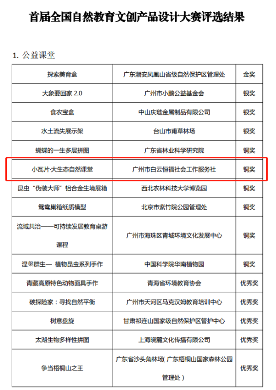 近日, 由中国林学会、广东省林业局联合主办的首届全国自然教育文创产品设计大赛的评选结果出炉,广州市白云区供销联社下属白云恒福社会工作服务社制作的“小瓦片·大生态自然课堂”在1000余件作品中脱颖而出,获得公益课堂组铜奖。