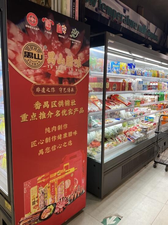 该小鲜驿站位于建筑风格多元、历史气息浓厚的广州热门街区一带,现主营农产品、日用品批发零售业务。这里,传统与潮流商户交融林立,人流熙攘,不少居民、游客前来采购商品。禺山腊味是沙头供销社合作开放办社企业“禺山生鲜”主打推广的番禺本土特色食品品牌,主营产销一系列以优质猪肉、鸭肉为原料的腊肠、凤凰盏等腊味产品。