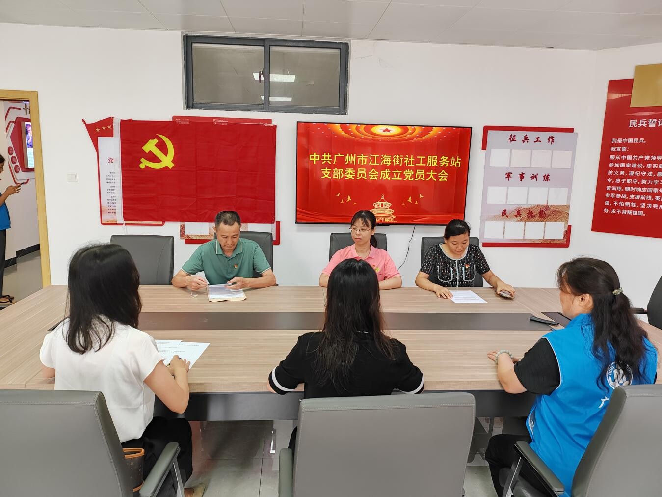 成立大会上,江海街道党建办主任胡娟娟宣读了《关于同意成立中国共产党广州市江海街社工服务站支部委员会的批复》。江海街社工服务站全体党员听取支部书记候选人预备人选情况介绍,并讨论通过了大会选举办法(草案),大会监、计票人。根据《中国共产党章程》和《中国共产党基层组织选举工作条例》,大会以无记名投票的方式选举出社工站党支部书记叶畅同志。