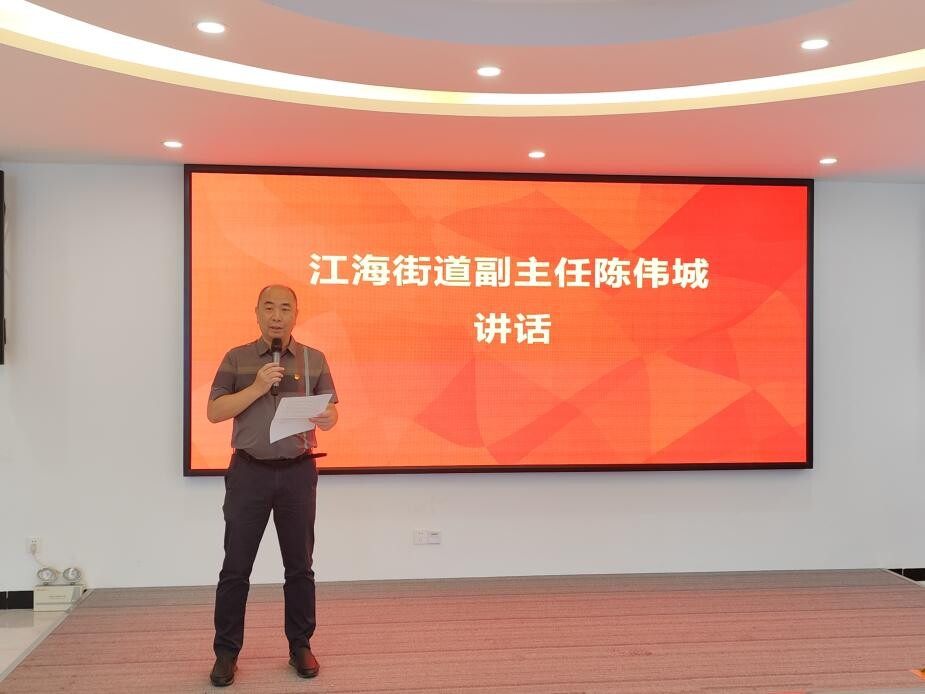 江海街道办事处副主任陈伟城代表街道党工委进行了发言,陈主任对社工服务站成立党支部表示热烈的祝贺,对在奋战在党建一线的工作人员表示感谢!并对社工站党支部的发展提出希望:希望社工站党支部,在支部书记的带领下,发挥支部战斗堡垒作用,发挥党员模范带头作用,勇当先锋,为社工站的发展作出积极贡献。