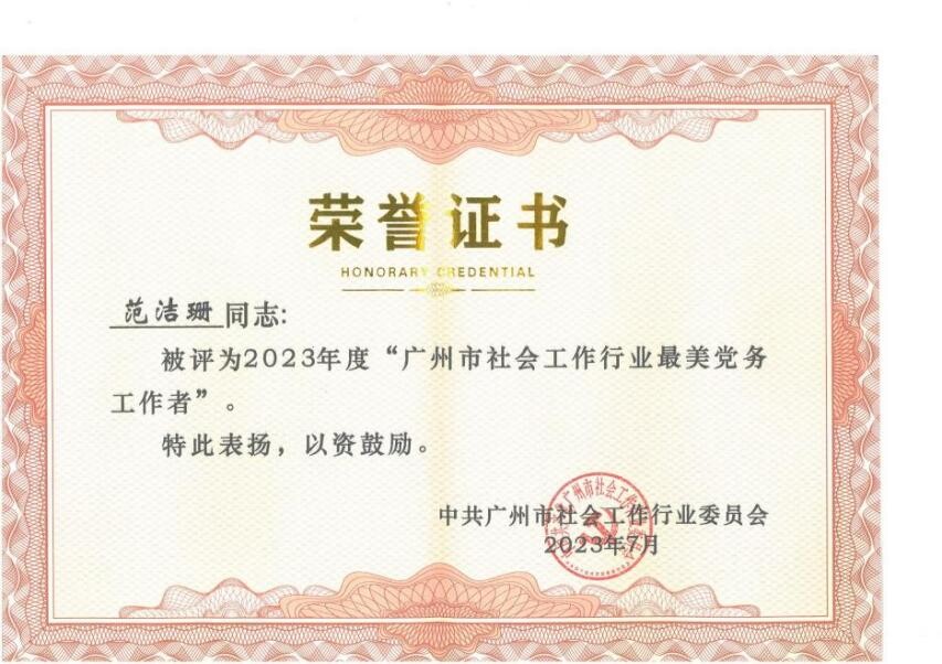 广州市恒福社会工作服务社党支部获评“红旗党支部”,恒福社工范洁珊同志获评“最美党务工作者”称号。