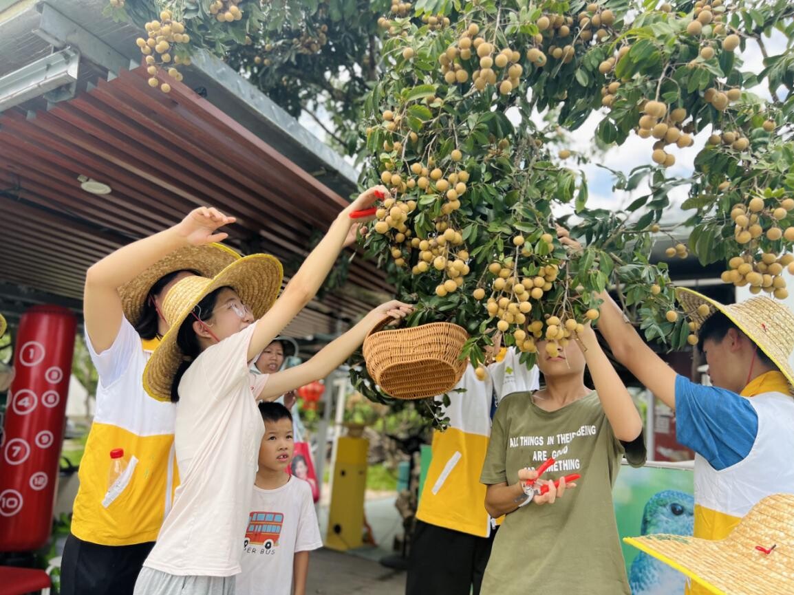 带着制作微景观的喜悦心情,青少年们拿着采摘所需的果篮和剪刀,沿着营地的小道徒步到龙眼果园。大家分工协作,齐齐行动。有人负责爬上梯子剪下枝枝硕果,有人负责分拣采摘下来的龙眼……现场一片欢声笑语,青少年们一边品尝新鲜采摘的龙眼,一边体验农事劳作的乐趣。