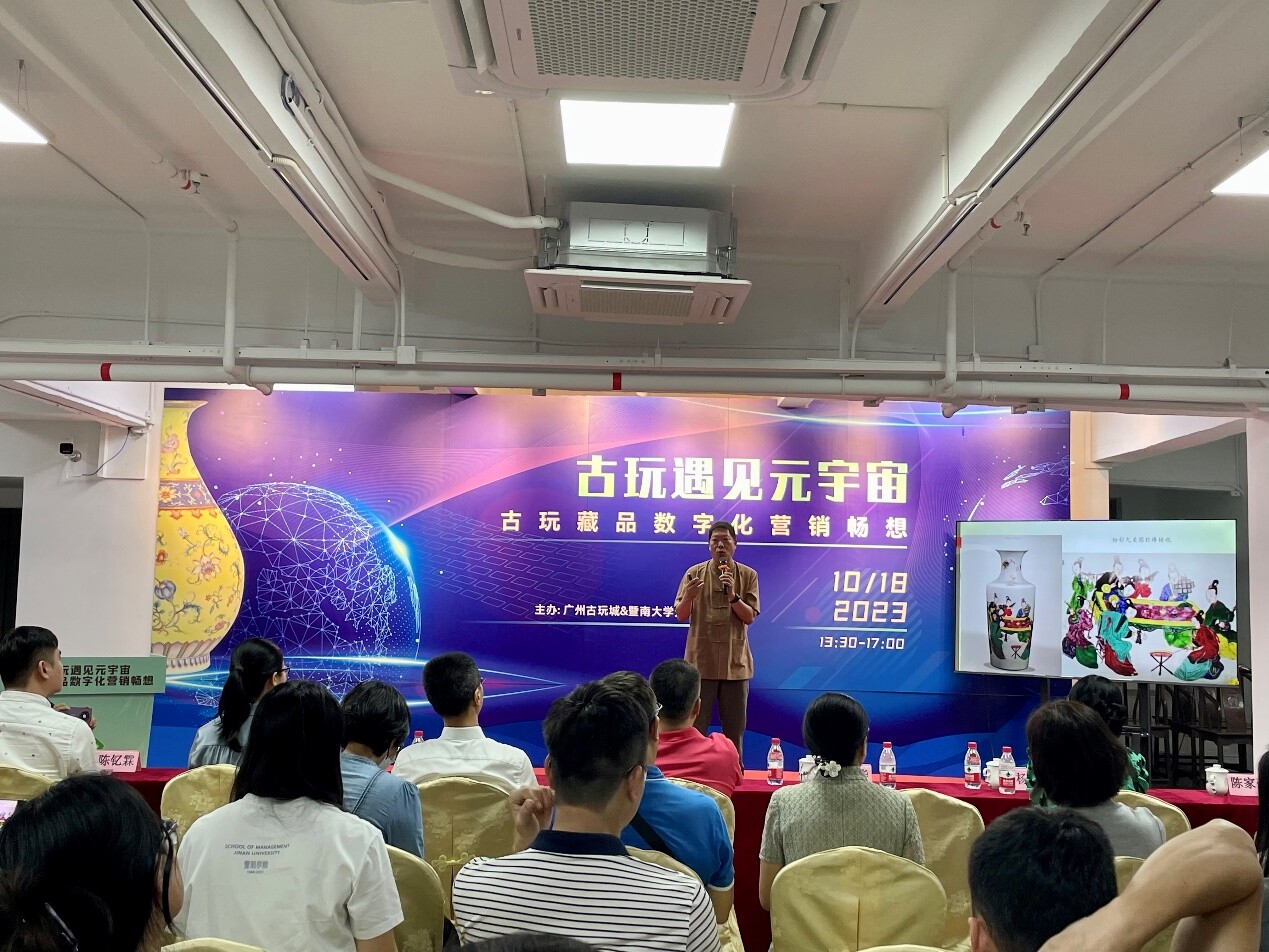 10月18日,广州古玩城与暨南大学元宇宙俱乐部在五楼多功能展厅共同举办“古玩遇见元宇宙--古玩藏品数字化营销畅想”活动。