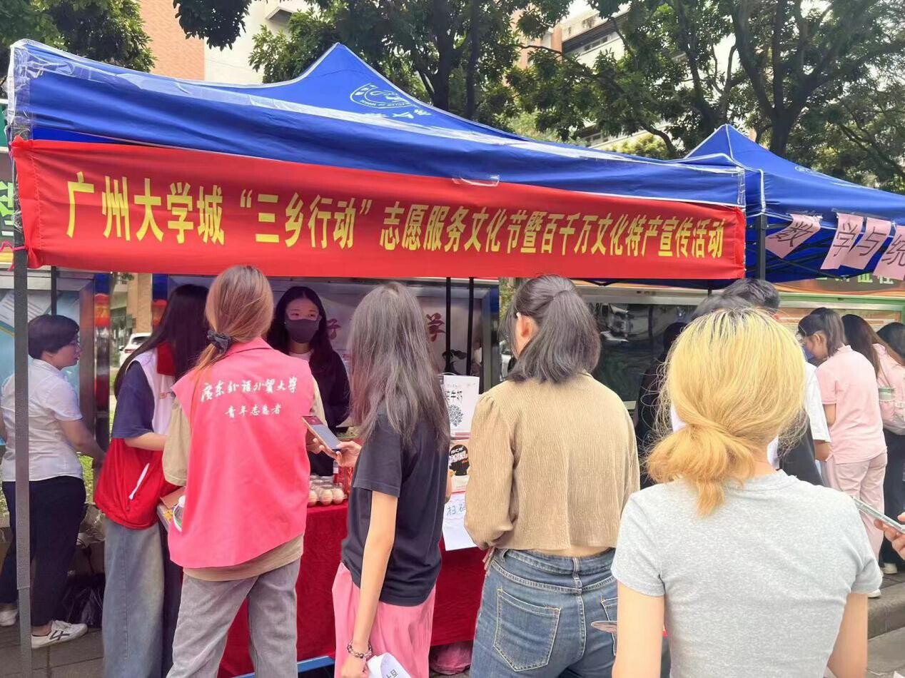 4月25日下午,由广州大学城志愿者协会、广州大学城“三乡行动”工作总站共同主办的广州大学城“三乡行动”志愿服务文化节暨百千万文化特产宣传活动在广东外语外贸大学广州大学城校区举行。番禺区石基供销社组织参加番禺区对口帮扶协作(合作)地区优质特色农产品“进校园”展销推广活动。