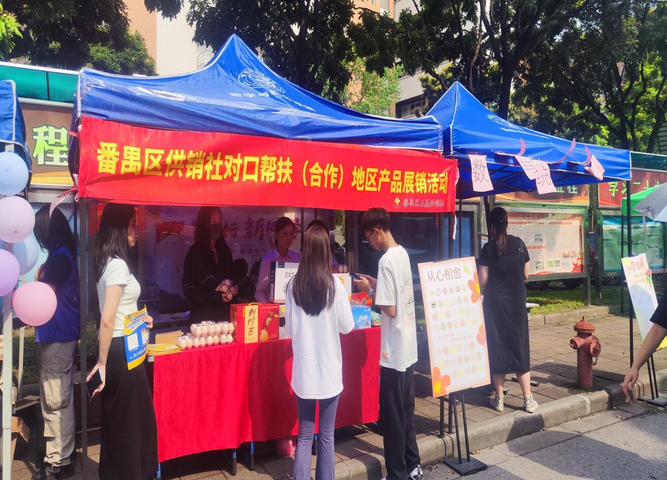 摊位上,石基供销社精心拣选了来自福建上杭、贵州、新疆、梅州五华等番禺对口帮扶(合作)、东西部协作、援疆地区特色农产品进行展示展销推广,有贵州刺柠吉、上杭花生、新疆纯牛奶、鸡蛋、萝卜干、客家特产鸡爪。石基供销社工作人员笑容可掬地为来宾介绍质优农产品,并推广使用百越网购微信小程序。现场共吸引逾1000人次驻足光顾品尝、购买。大学城师生们异口同声地表示很难得能在校门口近距离品尝到正宗帮扶地区名特优农产品,纷纷称赞打卡。活动期间,番禺“三乡”总队的志愿者们积极宣传广州大学城“三乡行动”志愿服务,有关负责人表示会加大推动高校青年学生下乡返乡兴乡力度,加强与供销社、帮扶合作企业等合作,挖潜在产业帮扶、消费帮扶、乡村创新创业、乡土文化传承等领域的作用,多为家乡做点事,讲好家乡故事。