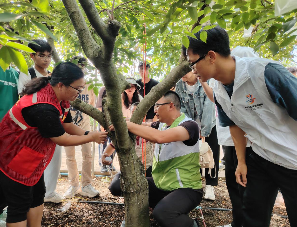 活动现场,广州市白云区祥记水果农产品专业合作社负责人首先介绍了祥记果园的种植历史、水果品种、疏枝疏花疏果方法、智慧化防虫、水肥一体化灌溉设施等现代农业技术知识,随后带领学员一起深入杨桃林寻找适合种植石斛的树杈或树干位置,开展石斛苗的捆绑固定、水苔覆盖保护等农业实践学习。仲恺农业工程学院的解老师说:“本次活动对学生很有吸引力,不仅加深了学生对农业发展的新理解,也让他们参与到向现代化、智慧化方向发展的果园种植管理的实践中去,做到知行合一。”学员们也纷纷表示,不仅增加了对农业产业模式的认识,自身的劳动实践技能也得到了提升。合作社负责人远哥说道:“果园主要种植杨桃等水果,本次活动种植石斛,充分发挥了果树和林下作物的生态互补效应,让土地利用率提升,丰富果园生物多样性,这一技术的开展,将有望实现增产增收可能。”