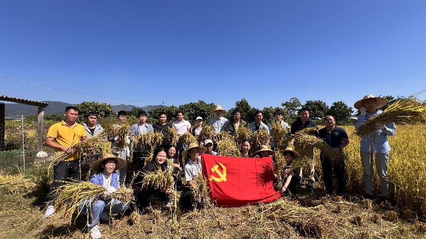全体职工到达丝苗米文化展览馆后,倾听讲解员系统介绍丝苗米的文化起源、种源保护,了解目前增城丝苗米产业现代化发展进程。随后,同志们便头戴草帽、手拿镰刀,走进田间体验稻谷收割,并在工作人员指导下使用传统机器进行稻谷脱粒,深刻体会农民种植辛苦劳作,感叹吃饱吃好来之不易。