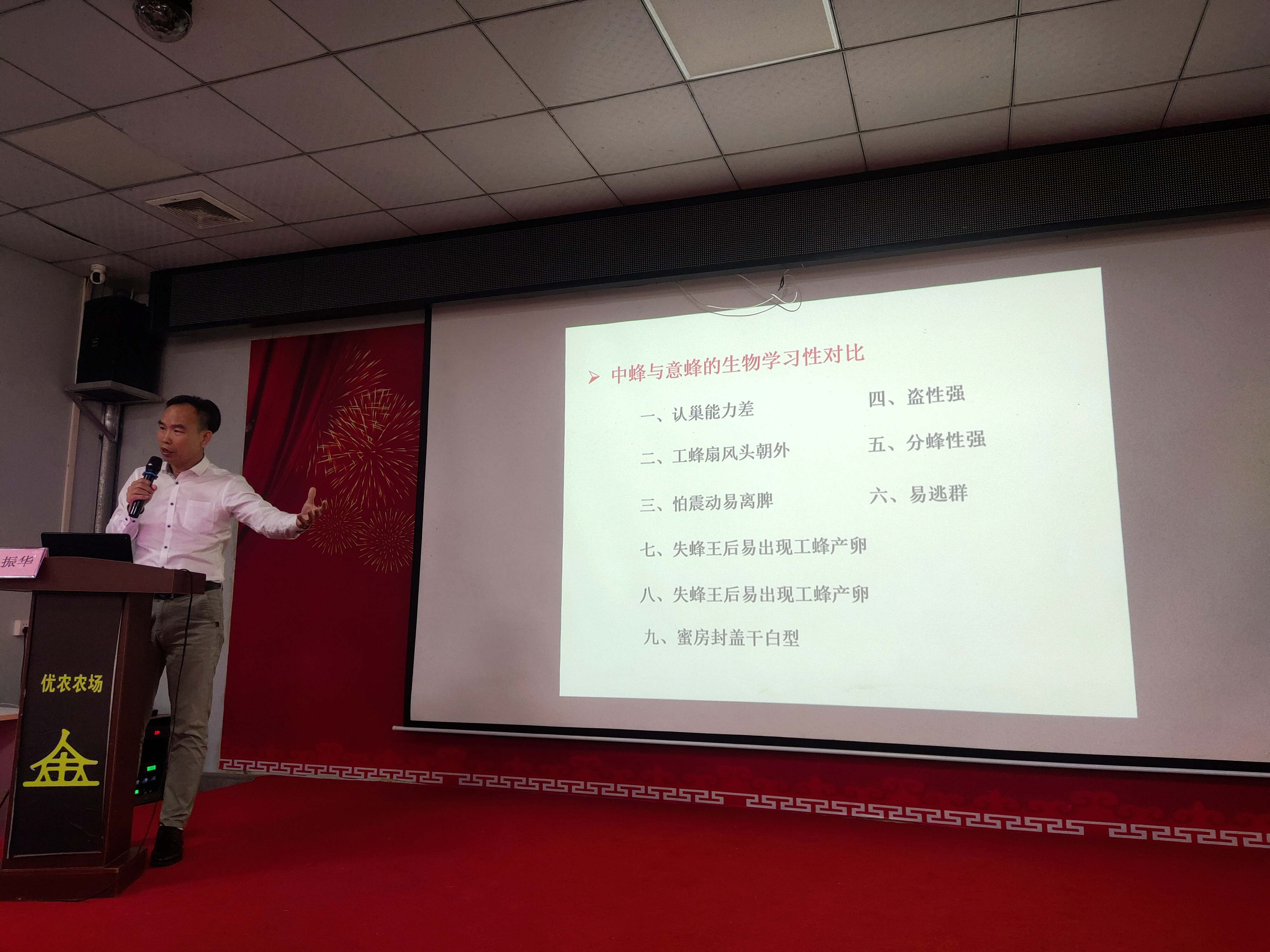 为贯彻落实国家省市有关供销合作社工作部署,推动“百千万工程”工作任务落实,提高专业合作社和农民养蜂技术,带动农民增收。2024年11月21日,广州市供销合作总社委托广东省蜂产品协会在广州市增城优农家庭农场成功举办了“赋能蜂农助力‘百千万工程’”养蜂技术培训活动。本次活动吸引了增城区专业合作社、蜂农、蜂产品企业代表共计50余人参与。本次培训邀请了广东省科学院动物研究所专家张学锋教授和广东省蜂产品协会曾振华副会长现场授课。专家们分享了近期全国蜂业的最新动态,通过互动问答的方式,使蜂农们更好地了解了行业内的最新进展。同时,广州市宝生园股份有限公司蜜蜂文化科普专员进行了蜂产品知识科普讲座,介绍了蜜蜂的生活习性、蜂产品的生产过程以及蜜蜂文化的重要性。讲座中还穿插了案例分享和互动问答,让蜂农们更好地理解和掌握相关知识。自由交流环节是本次活动的一大亮点,蜂农们积极分享自己的养蜂经验和心得,相互学习,共同进步。通过这样的交流,蜂农们不仅能够相互借鉴、取长补短,还能够建立起紧密的互助关系,共同推动养蜂业的发展。